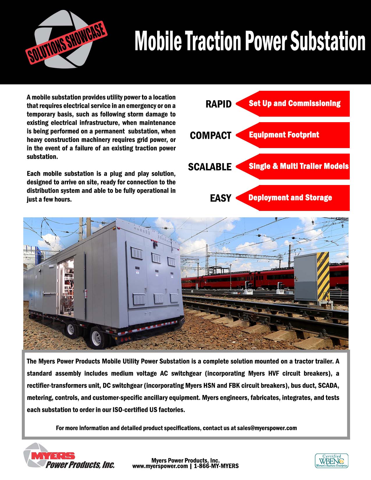 The Myers Power Products Mobile Utility Power Substation is a complete solution mounted on a tractor trailer. A standard assembly includes medium voltage AC switchgear (incorporating Myers HVF circuit breakers), a rectifier-transformers unit, DC switchgear (incorporating Myers HSN and FBK circuit breakers), bus duct, SCADA, metering, controls, and customer-specific ancillary equipment. Myers engineers, fabricates, integrates, and tests each substation to order in our ISO-certified US factories. |